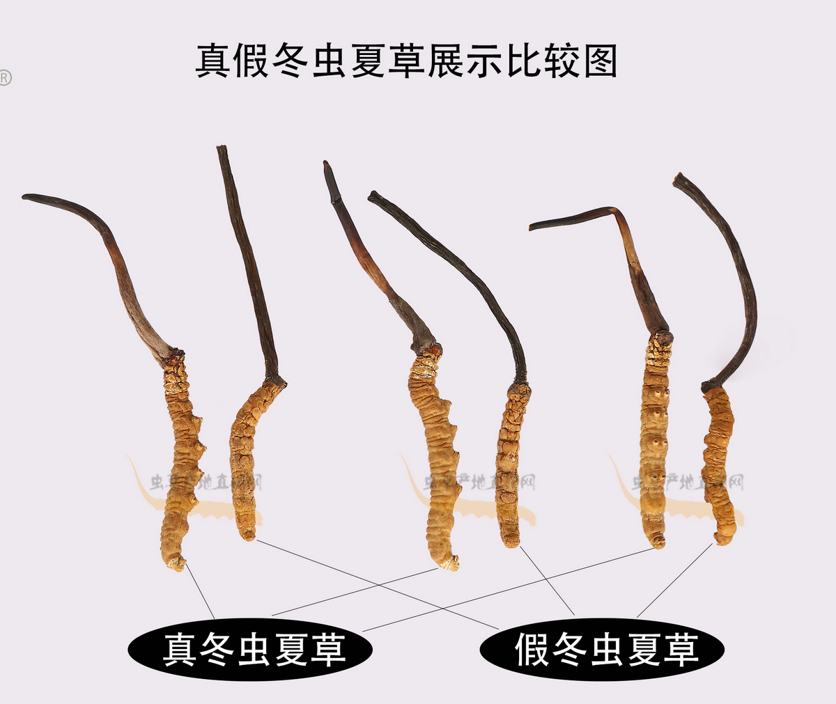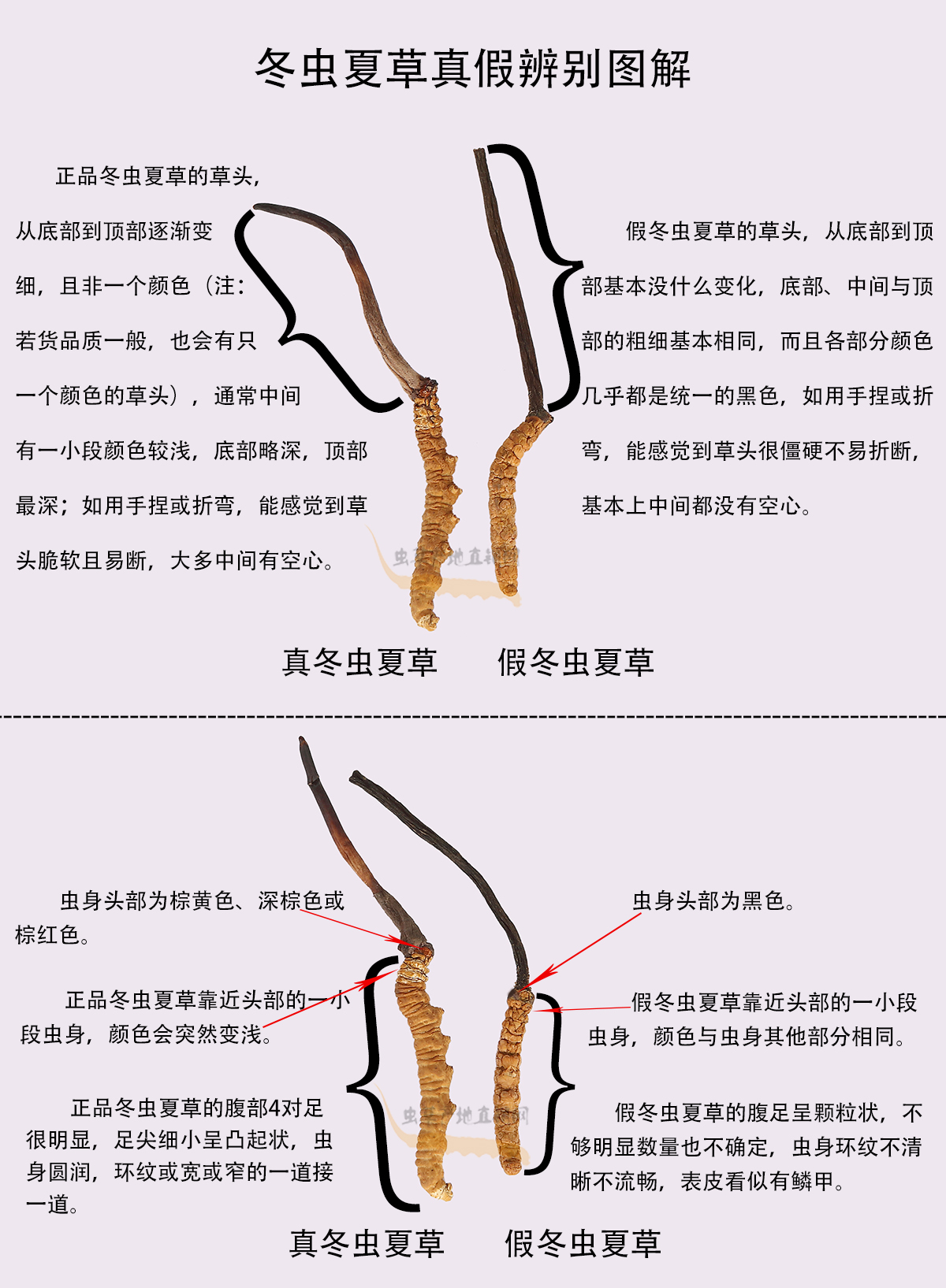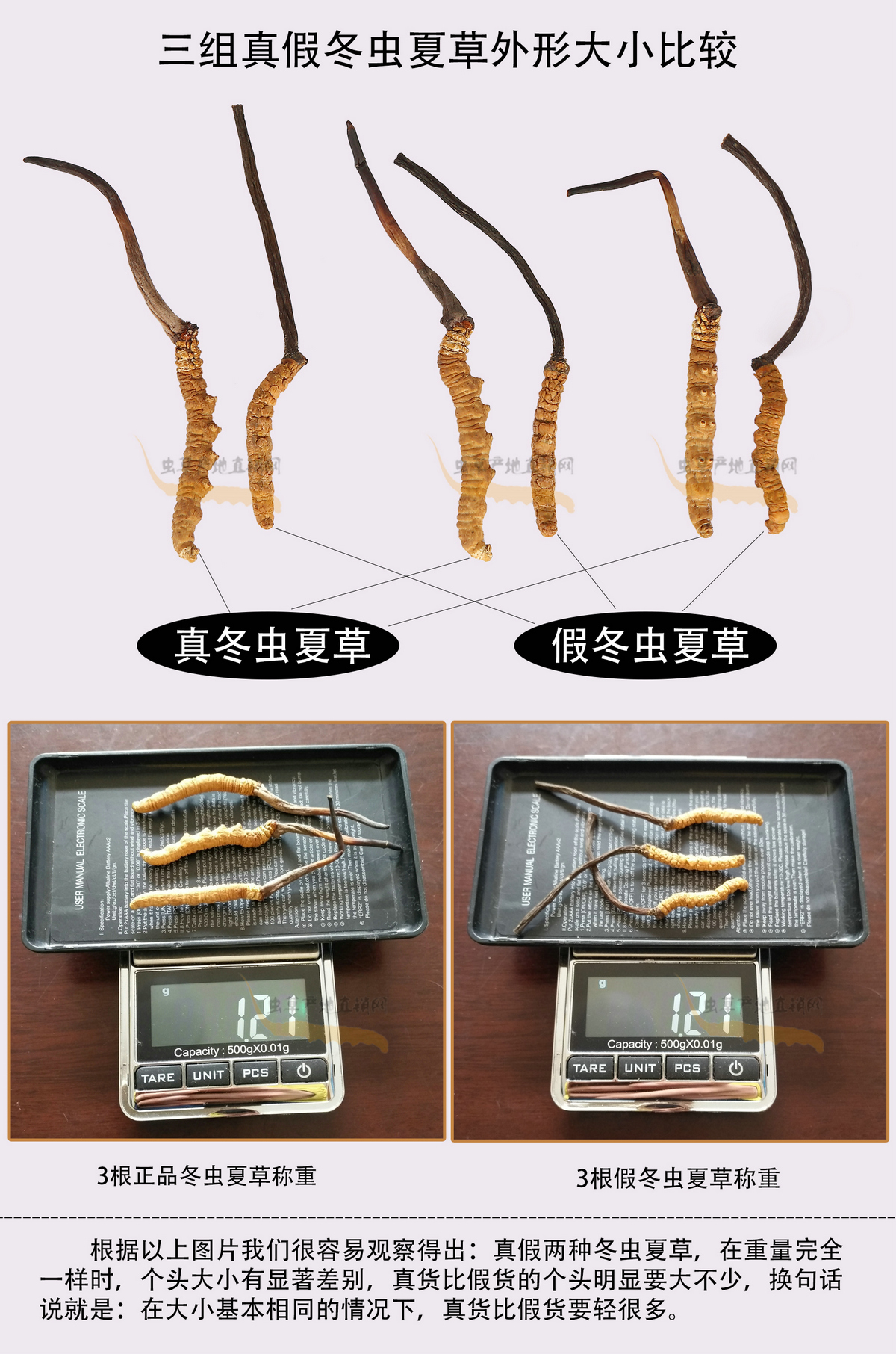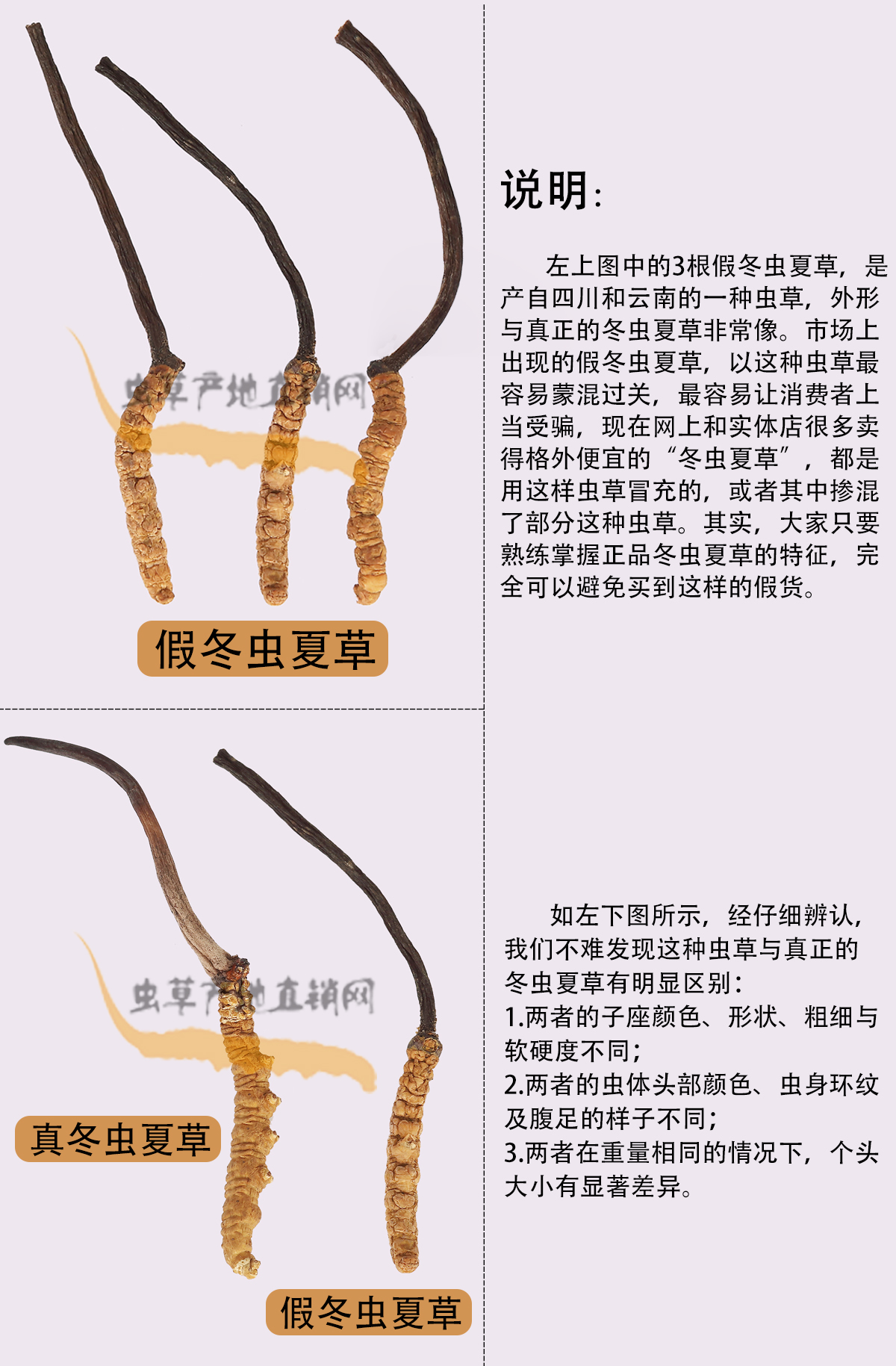 以上圖片,將這種產(chǎn)自四川和云南、極易被不法商家用來冒充正品的假冬蟲夏草與真冬蟲夏草的外形特征區(qū)別,介紹得非常清楚,相信大家在認(rèn)真看過之后,就能避免買到這種假蟲草了。